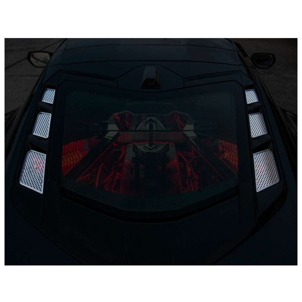 Take a look at these easy-to-install Perforated Stainless Steel Rear Hood Vent Inserts. You'll love these C8 Corvette accessories. They are outstanding in quality and workmanship worthy of your C8. What a great way to create a custom style and grab the spotlight. Our Corvette accessories are laser-cut for a precision fit and handcrafted in the USA.