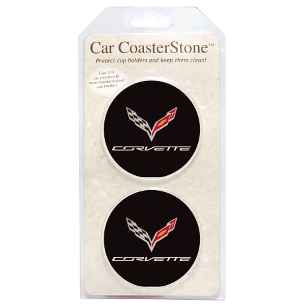 Set of 2 absorbent stone car coasters with the C7 Corvette crossed flags and signature. Fits most auto cup holders to absorb moisture. Easily removed for cleaning. 2-5/8” diameter.