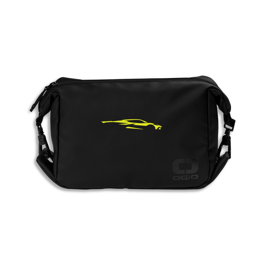 Stores gear, cords, pens, toiletries and more. Coated, grommeted zipper pulls. The front pocket is embroidered with the C8 Corvette car gesture in the C8 car color of your choice. Choose your color in the drop-down menu below.