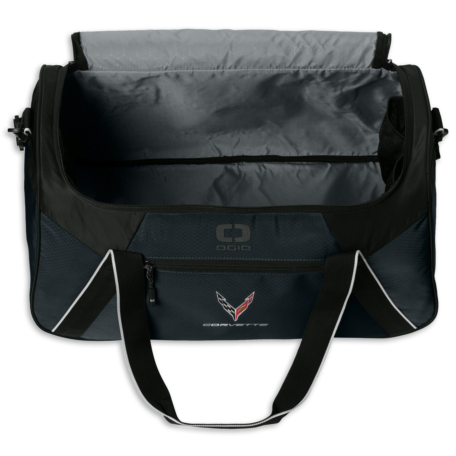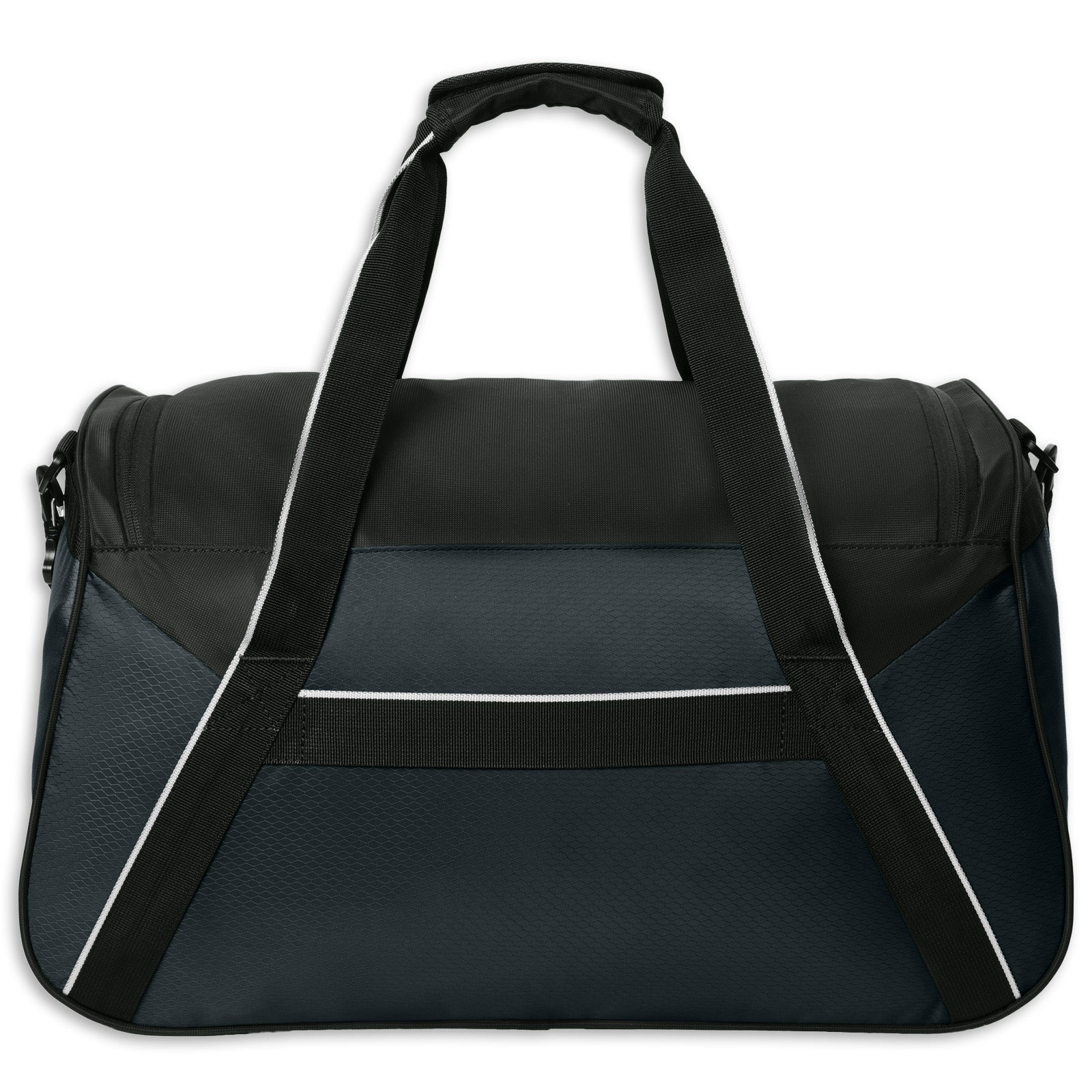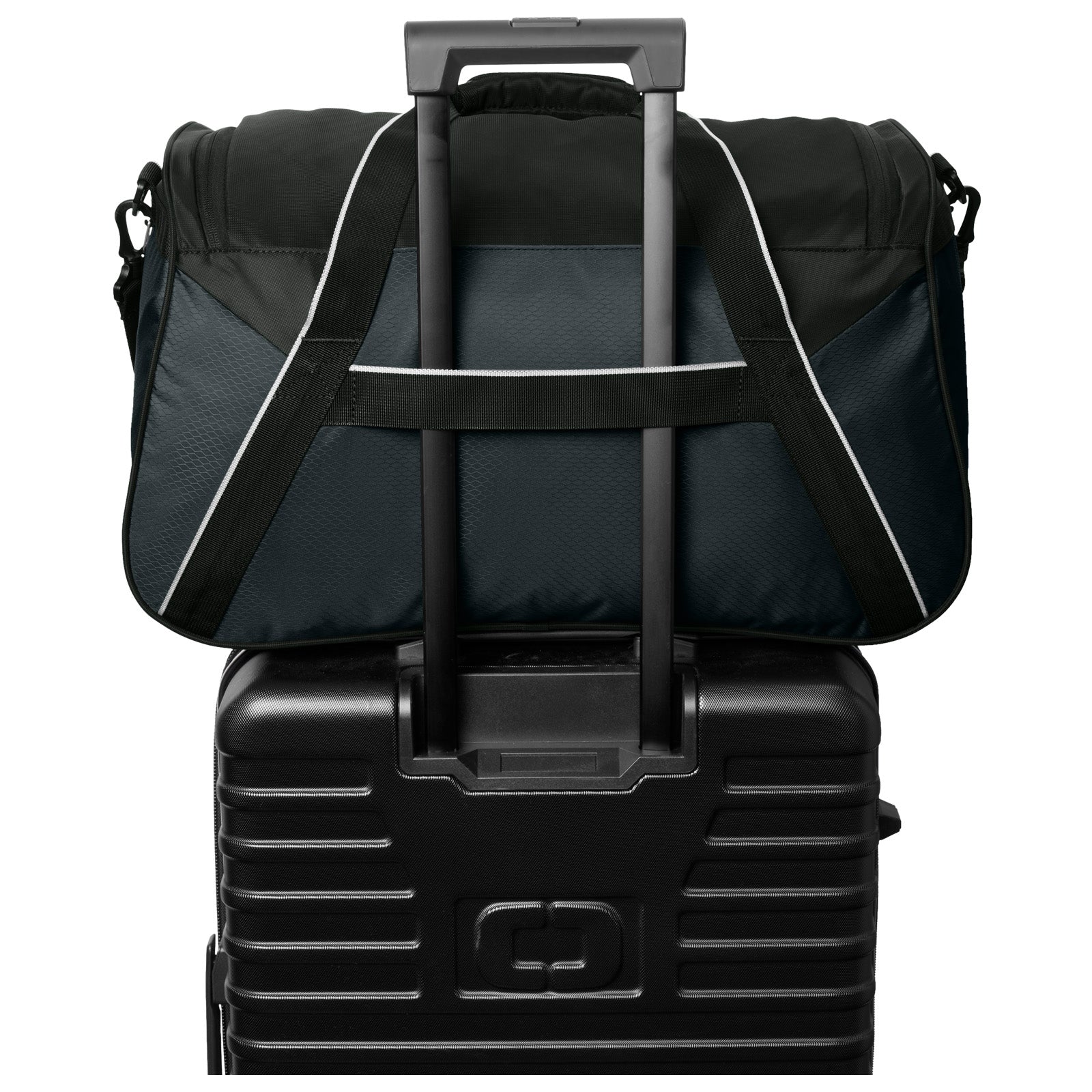 Zippered front pocket, interior left and right storage pockets, contrast tipped webbing, padded wrap handle, luggage trolley pass through on back, padded foam bottom for strength. 12"h x 21"w x 12"d