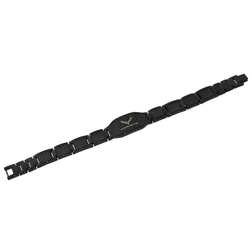 Elevate your style with this sleek C7 Corvette carbon fiber bracelet. Made with black stainless steel and carbon fiber inserts, this stunning bracelet features the C7 emblem. With a width of 1/2", adjustable design and a fold-over catch, it comfortably fits wrists from 7.25" up to 8.25".