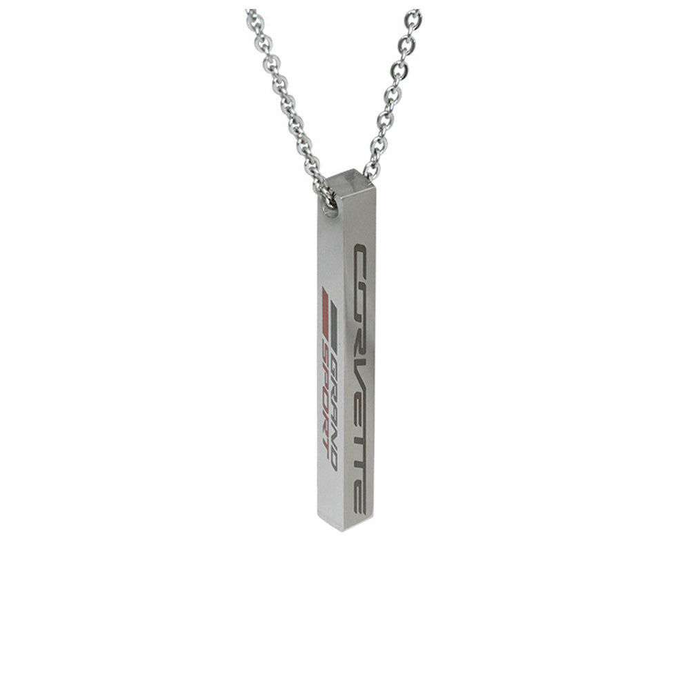 Crafted in sleek stainless steel, this pendant features the C7 Corvette signature on the front and the C7 Grand Sport emblem on both sides. Measuring 2" long by 3/16" wide, it flaunts a lightweight design. Be ready to turn heads a show off your love for Corvette with this must-have accessory!