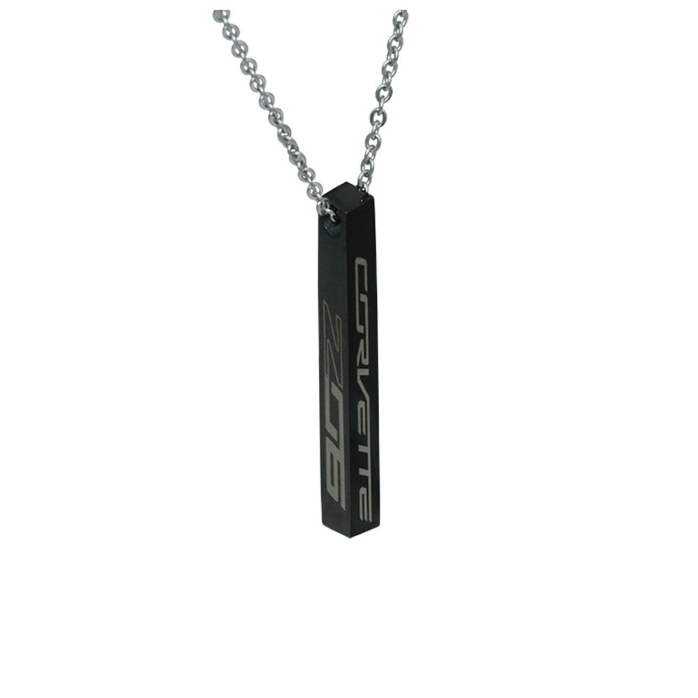 Crafted in sleek stainless steel, this pendant features the C7 Corvette signature on the front and the C7 Z06 emblem on both sides. Measuring 2" long by 3/16" wide, it flaunts a lightweight design with edge and modernity.