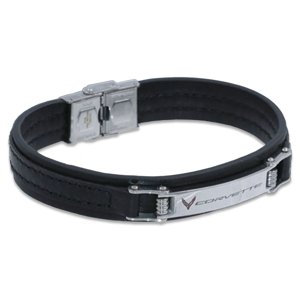 C8 Corvette black leather bracelet with a stainless steel ID plate featuring the crossed flags and signature. The bracelet measures 13 mm wide and has a fold over catch. Fits wrists to up 8.25”.