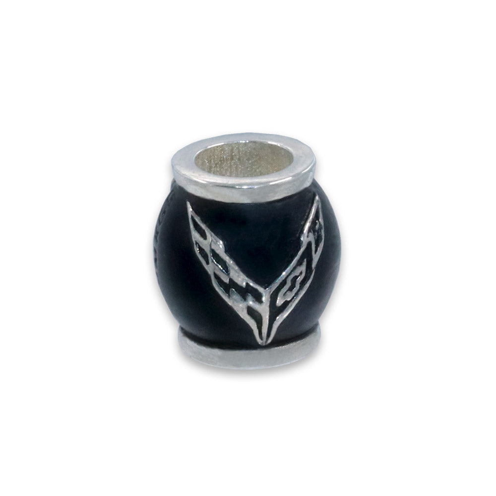 This C8 Corvette Pandora style barrel charm comes with wrap-around emblems and is made of sterling silver and black enamel. The charm hole is large enough to go over the screw-type bracelets and fits Pandora, Chamilia, Biagi, Pugster, Troll and other bracelets.