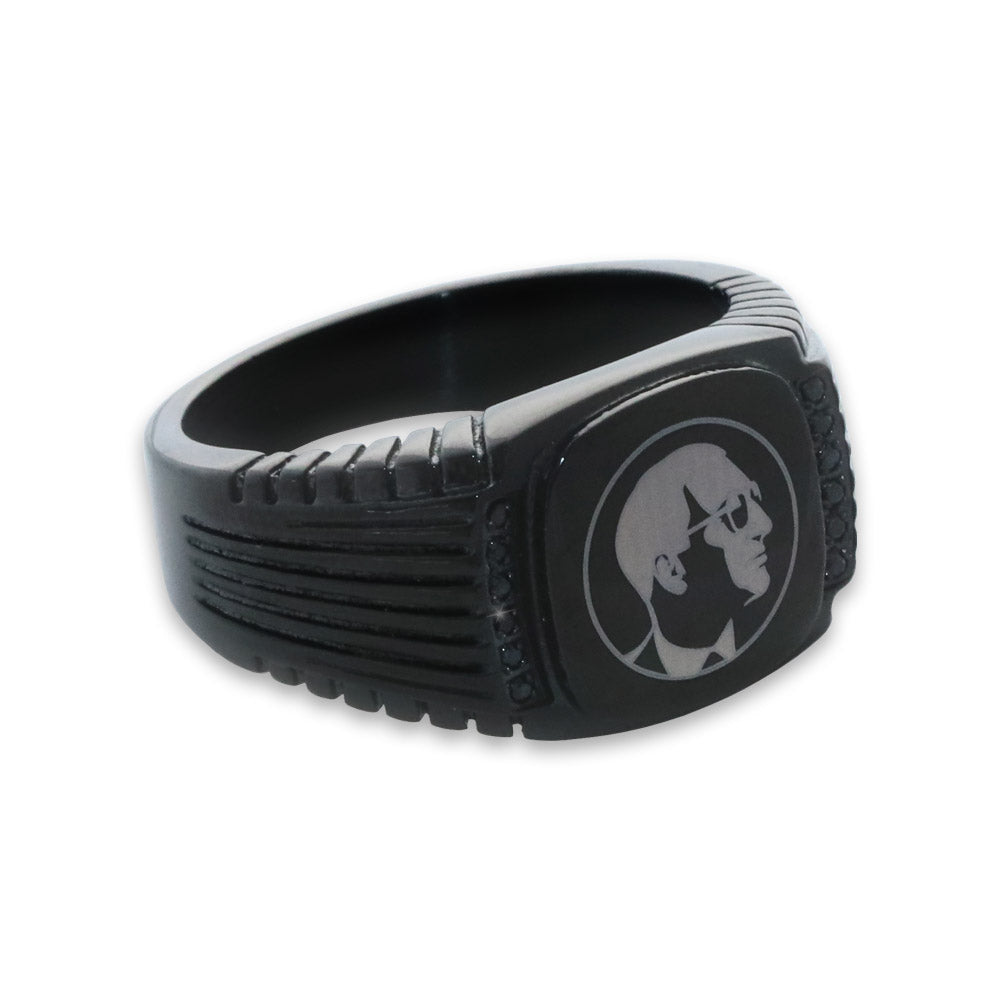 This men’s C8 Corvette signet ring packs a lot of punch for those die-hard Corvette people. Ring sports the profile of Zora Arkus-Duntov, the “Father of the Corvette”. It is black IP-plated stainless steel and has 12 black cubic zirconia stones, six on each side of the Zora emblem. The grooved ring sides give an edgy yet sporty appearance. This is one great-looking ring! Whole sizes from Size 9 to 12. Please choose Ring size below.
