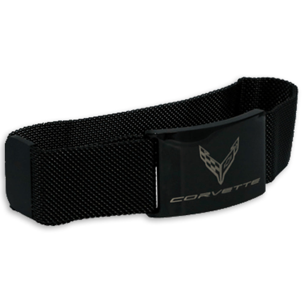This C8.R Corvette Racing Crossed Flags bracelet is made of black mesh stainless steel. The stylish magnetic wrap bracelet is 21mm wide. Bracelet fits wrists up to 8.5″ and easily slides over your wrist for a perfect fit. Made in the USA.