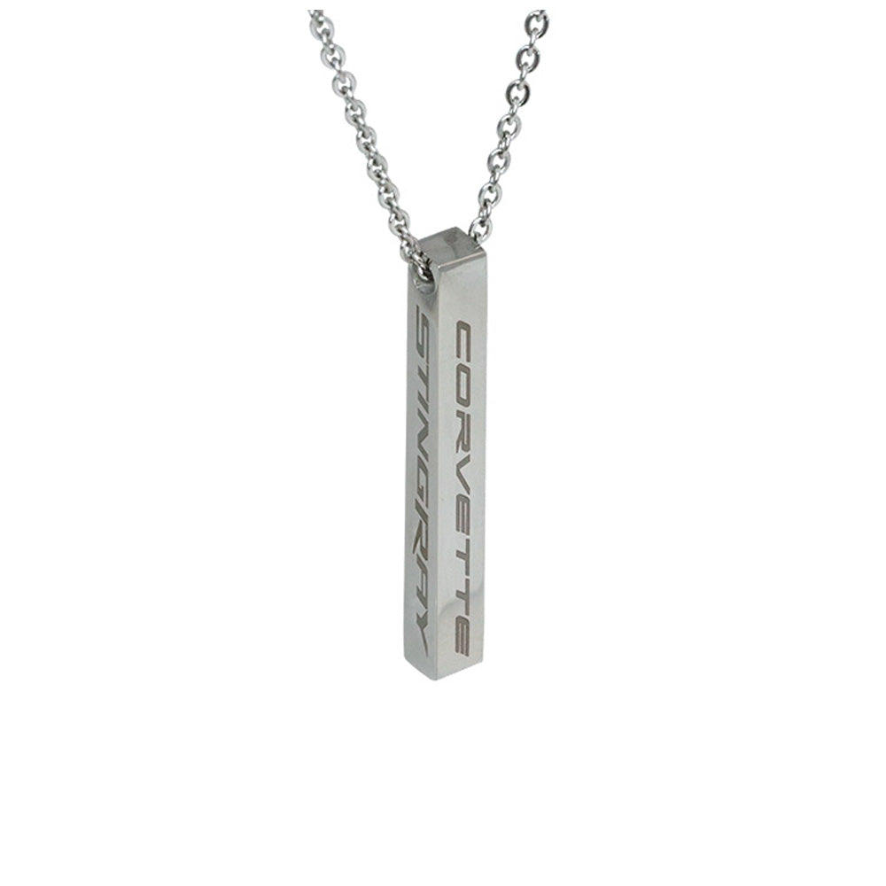 Rev up your style game with this unisex C8 Stingray Corvette pillar bar pendant! Crafted in sleek stainless steel, this pendant features the Corvette Signature on the front and the C8 Stingray on both sides. Measures 2" x 3/16 " and is lightweight.