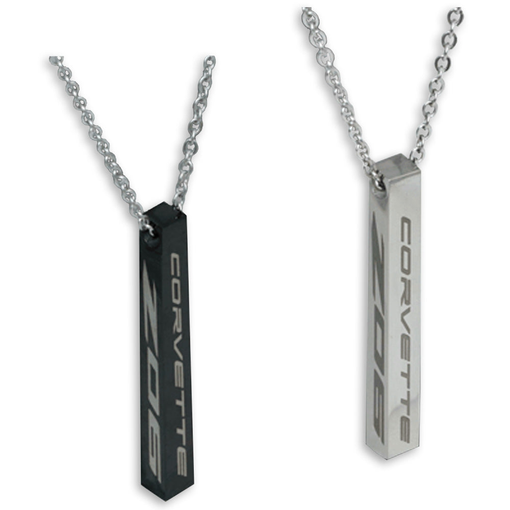 This C8 Corvette Z06 pendant comes with the Corvette signature on the front and the C8 Z06 signature emblems on two sides. The pendant measures 2” long by 3/16″ wide, is made in stainless steel and includes an 18″ cable chain. Made in the USA.
