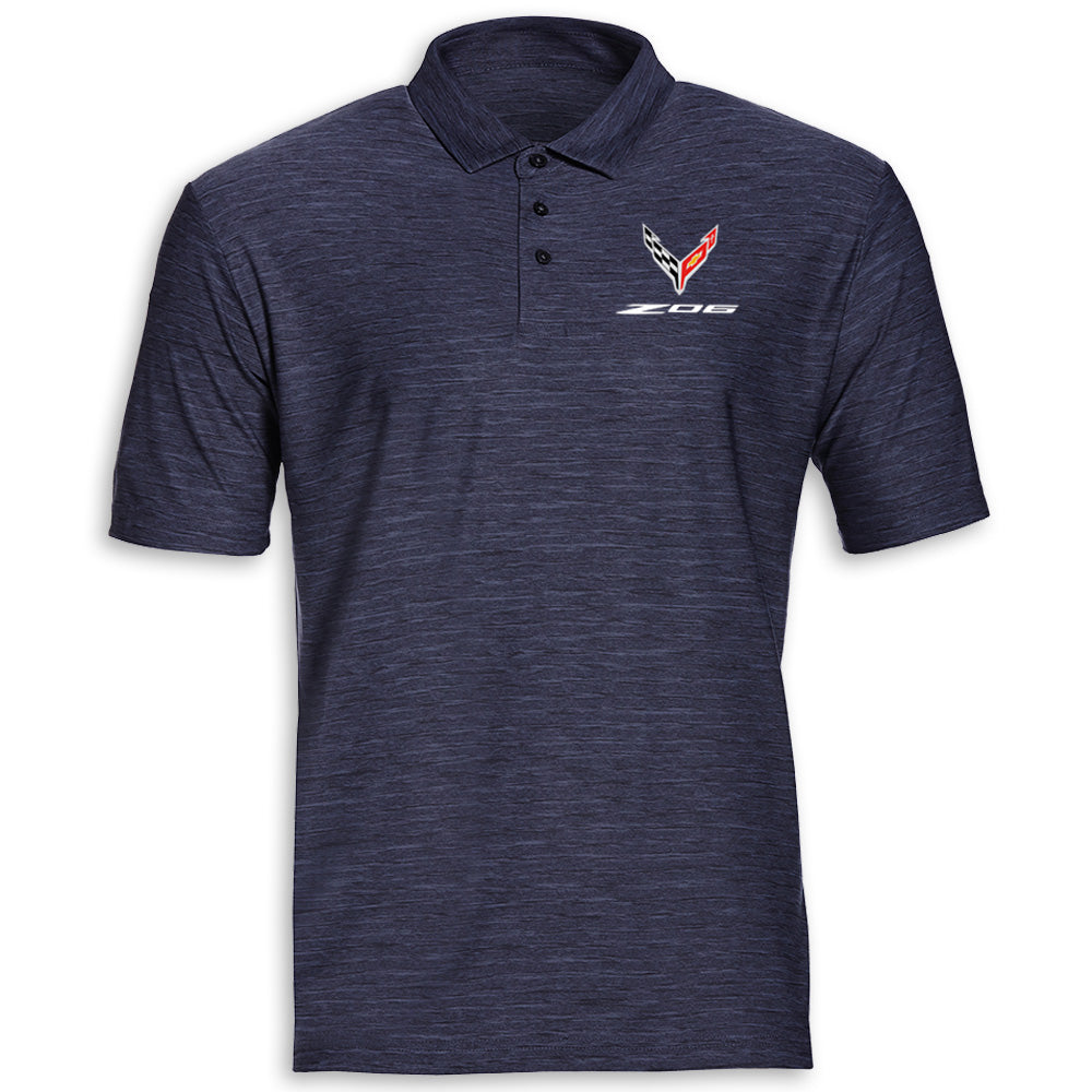 Single knit moisture-wicking polo with UPF 25 protection. Enhanced stretch technology with innovative seams, 3-button placket, self fabric collar, and open sleeves. Double-needle hemmed bottom with side vents. Embroidered C8 Z06 crossed flags and signature on the left chest. 100% polyester.