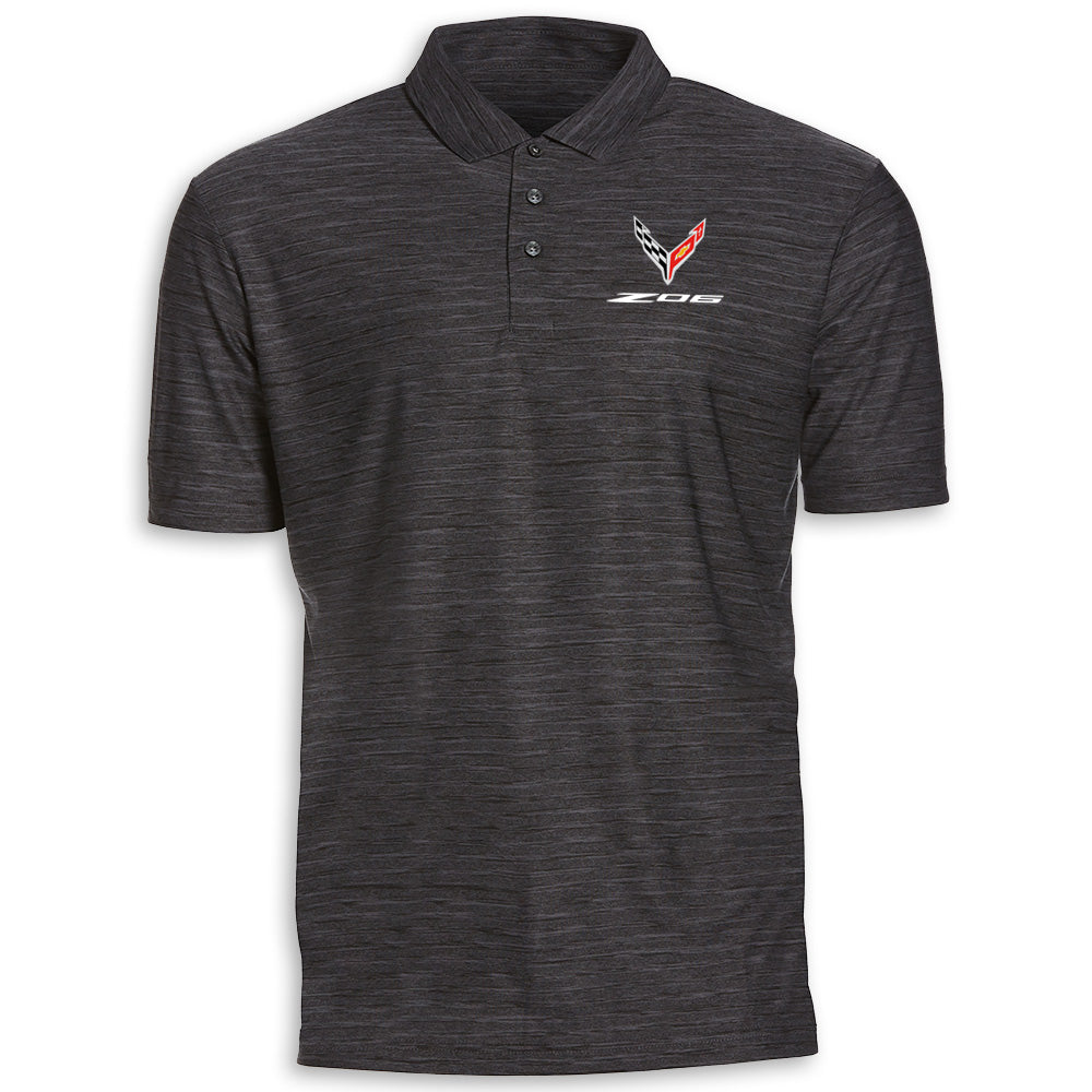 Single knit moisture-wicking polo with UPF 25 protection. Enhanced stretch technology with innovative seams, 3-button placket, self fabric collar, and open sleeves. Double-needle hemmed bottom with side vents. Embroidered C8 Z06 crossed flags and signature on the left chest. 100% polyester.