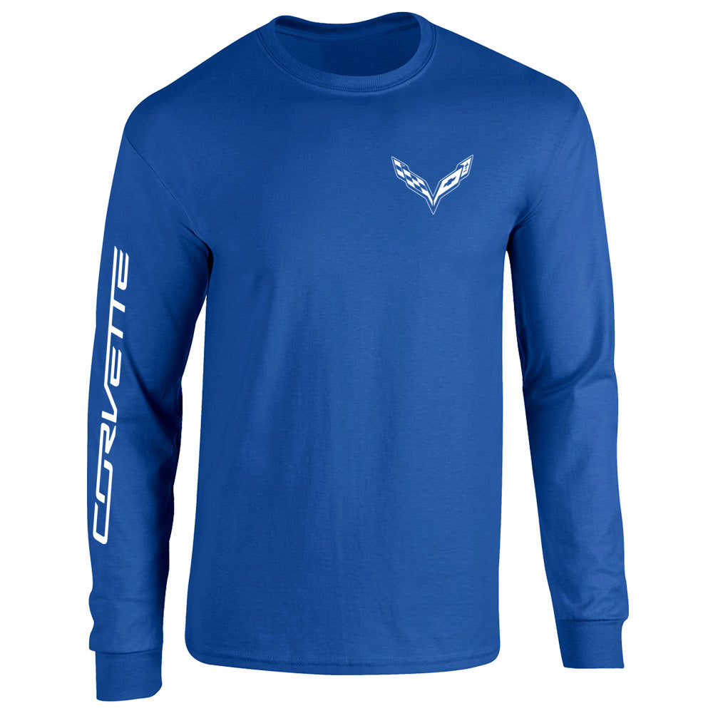 Double-needle stitching throughout, seamless ribbed neck, shoulder-to-shoulder taping, ribbed cuffs. White C7 crossed flags on the left chest, and Corvette signature on the right sleeve. 100% USA cotton.
