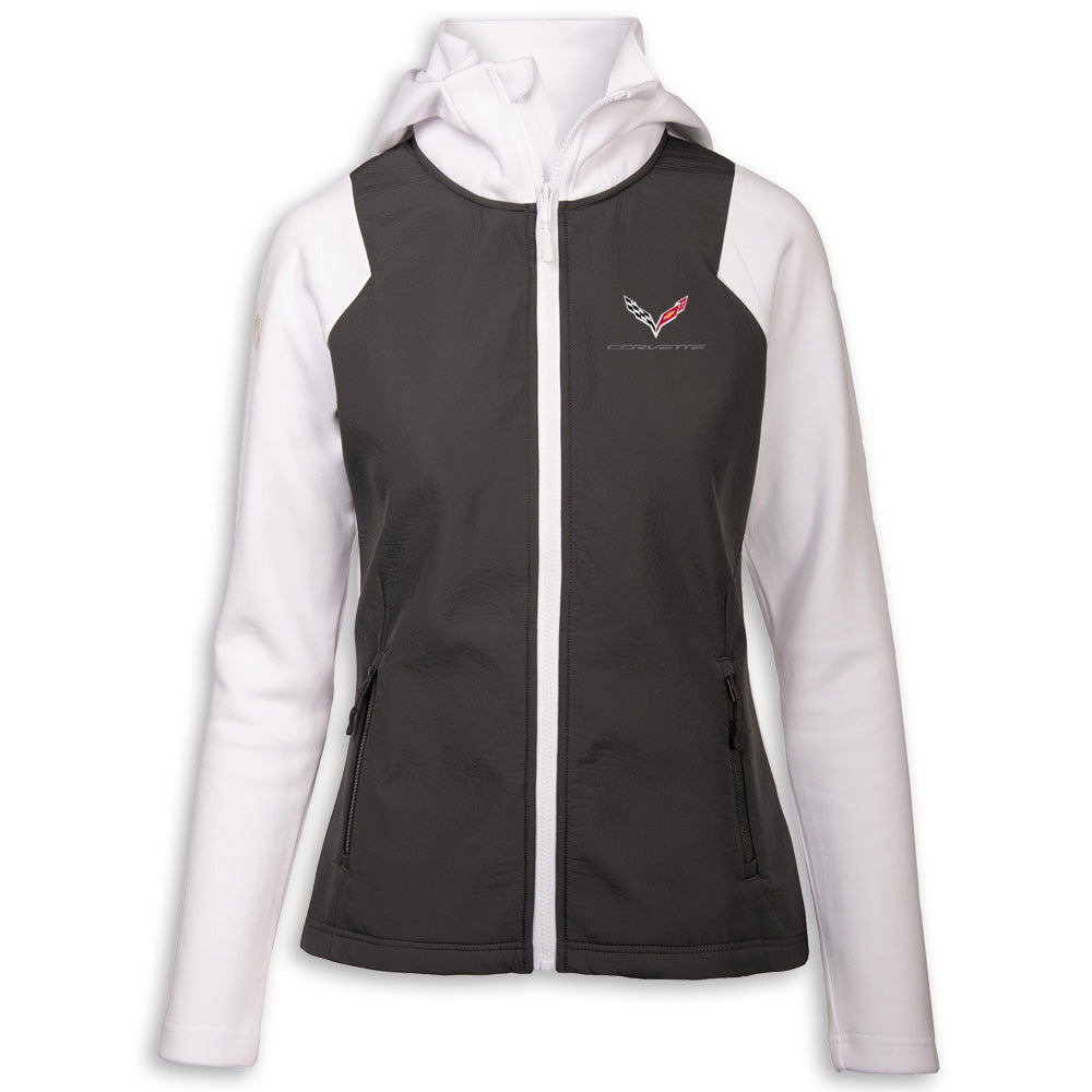 Contrast hooded full-zip with a high mock-neck hood, contrast bonded chest panel fabric, side zippered pockets, raglan sleeves, bottom darts, and a drop tail hem. C7 crossed flags and signature on the left chest. White/Charcoal. 100% polyester.