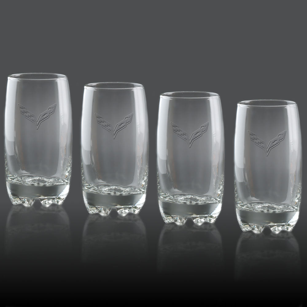 Stylish glassware made with lead-free clear crystalline, heavy base, and etched C7 Corvette crossed flags with deep polished cuts. Set of 4. 14 oz.