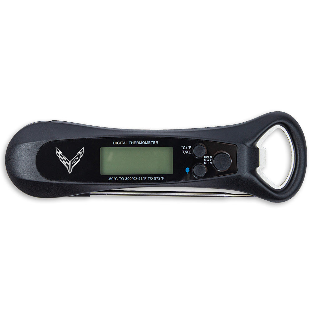 Foldable probe with fast response time for accurate cooking. Waterproof and features an LED backlight, backside magnet, and bottle opener. Auto-off after 10 minutes and battery included.