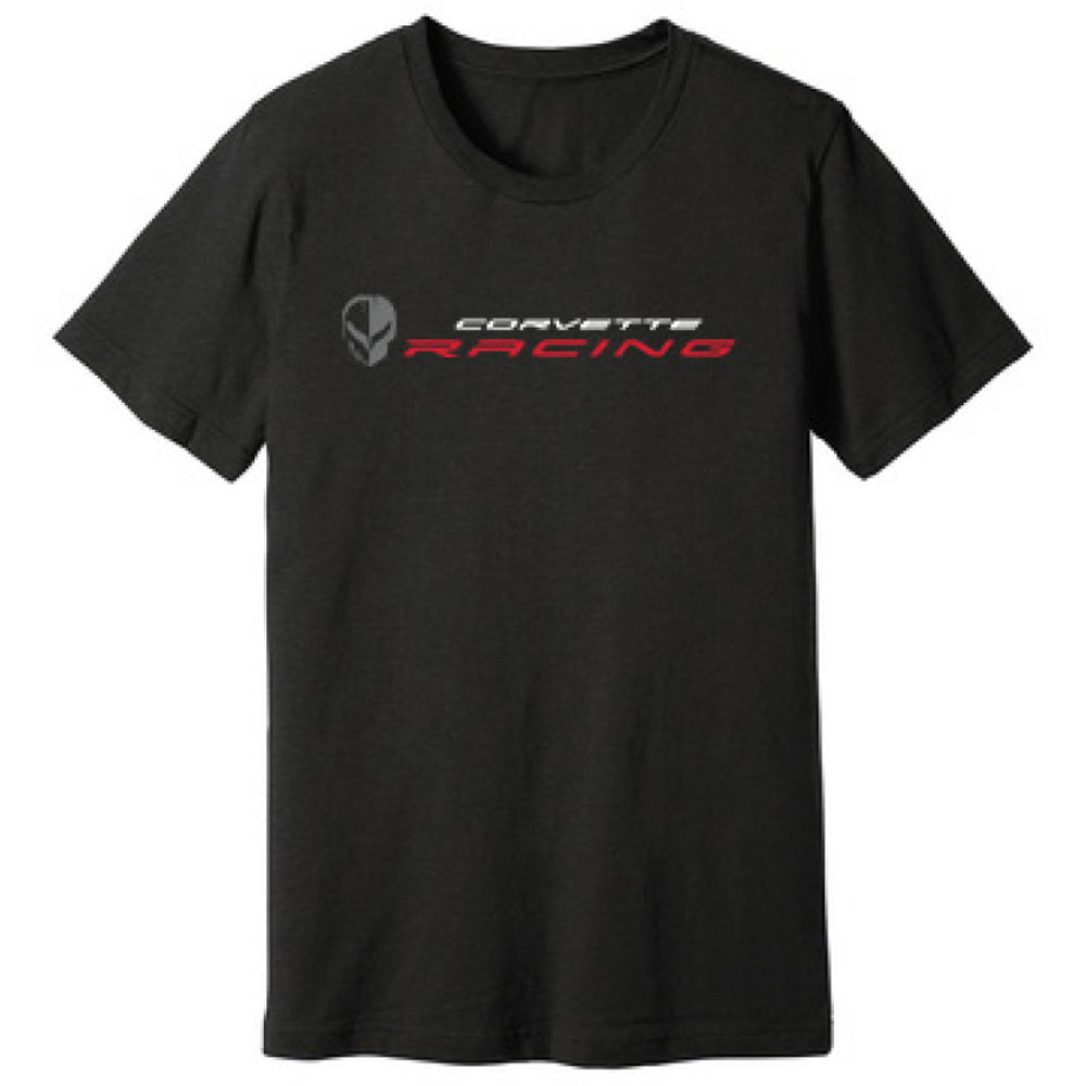 Black, comfortable, retail fit tee with Corvette Racing word mark logo on the front. Features side-seaming, shoulder taping, and the Z06 GT3.R logo on the back. Made of 100% Airlume combed and ring spun cotton/poly.