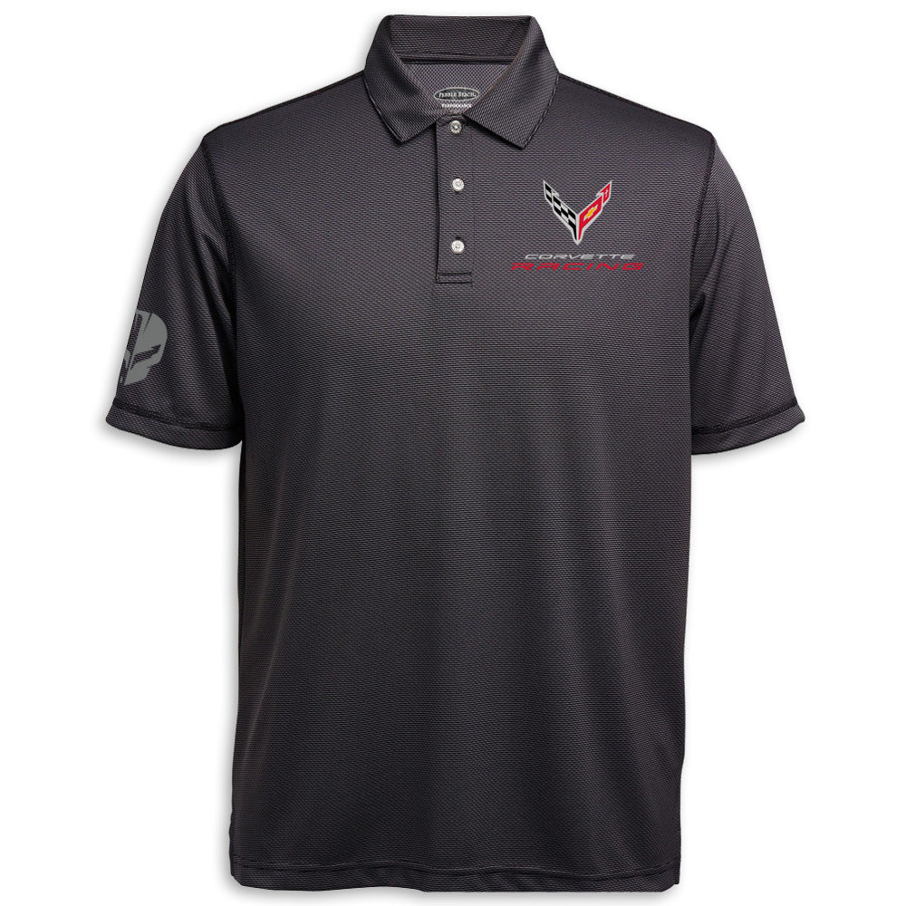 Polyester moisture wicking fabric polo featuring self-fabric collar and three-button placket. Corvette Racing logo on left chest, JAKE logo on right sleeve, and GT3.R logo on left sleeve.