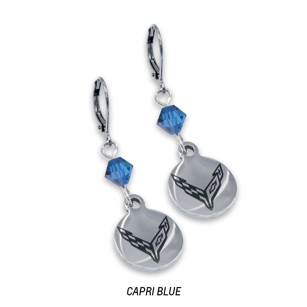 These C8 Corvette crystal earrings sport the C8 emblem with your choice of color. Disc measures 5/8” and overall length is 1-7/8″. Made of stainless steel.
