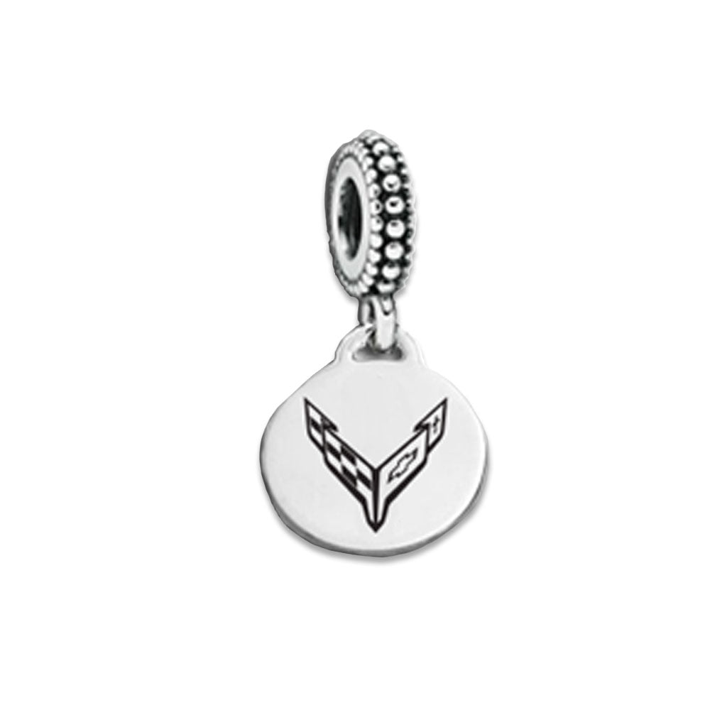Sterling silver dangle charm featuring the Next Generation Corvette crossed flags. Bead base is large enough to go over the screw-type bracelets and fits Pandora, Chamilia, Biagi, Pugster, Troll and other bracelets.