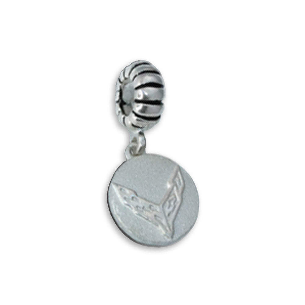 This C8 Corvette dangle charm comes with an antiqued fluted base and C8 tonal crossed flags disk.. The charm base is large enough to go over the screw-type bracelets and fits Pandora, Chamilia, Biagi, Pugster, Troll and other bracelets. Sterling silver base with stainless steel disc charm. Made in the USA.