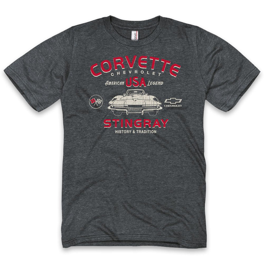 When it comes to history and tradition, the Chevrolet Corvette is loaded with both. Vintage graphics with the front-on view of the C2 Corvette on this tee. Heather Dark Gray. 65% polyester/35% cotton. Imported.